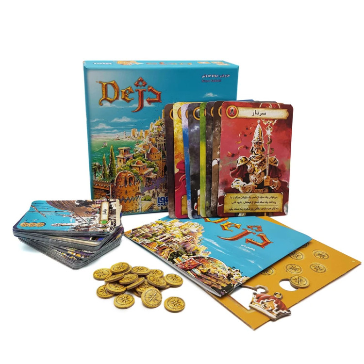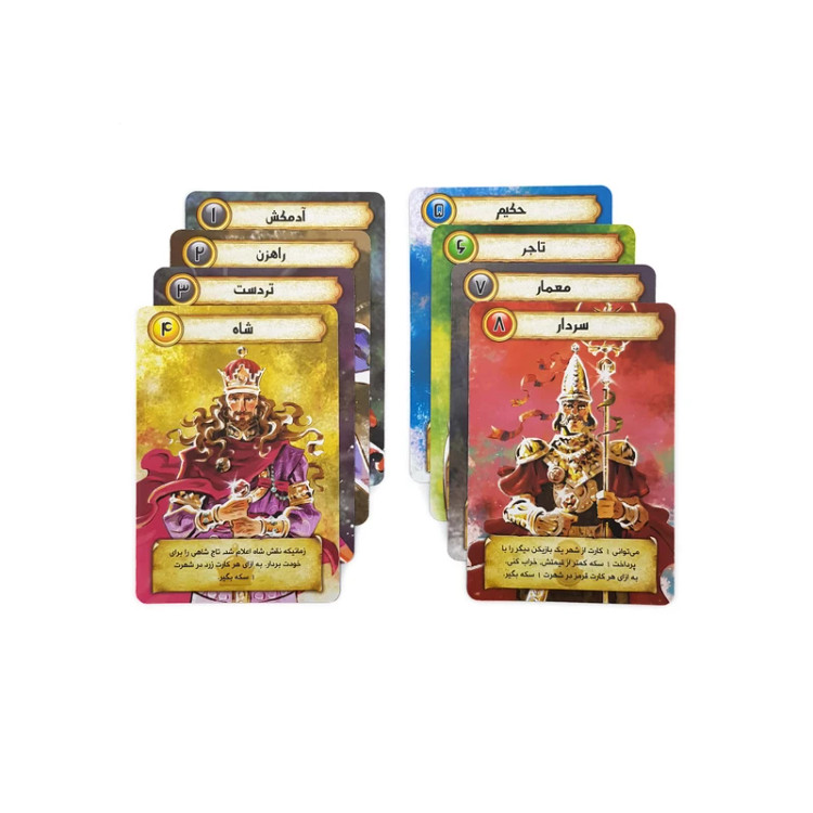 68 کارت سازه + 8 کارت نقش + 7 کارت نقش + 27 نشان سکه + نشان تاج + راهنمای بازی